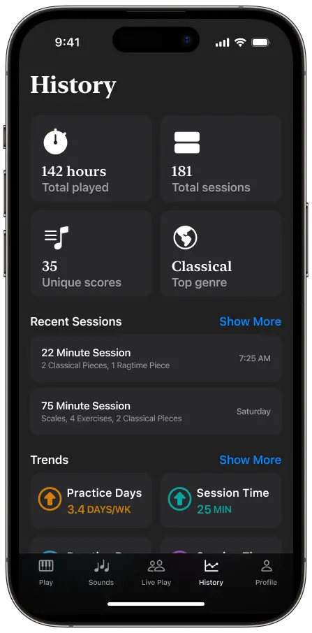 Ivory Sound is introducing the world's first Smart Piano™. Enabled by a continuous WiFi connection, your piano connects you to your piano teacher remotely, allows you to stream music right to your piano's speaker system, automatically tracks and analyzes your sessions, and allows you to manage your instrument's sounds with ease.